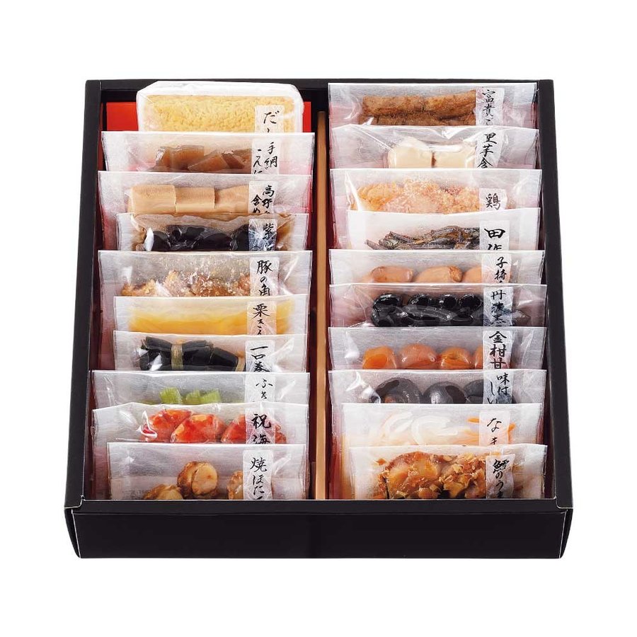 (約2〜3人前) ■化粧箱入り:340×325×75mm ■重量:約2.2kg ■セット内容 20品 田作り25g,丹波黒黒豆60g,ふきのうま煮,50g,里芋含め煮4個,富貴ごぼう50g,鱈のうま煮60g,一口巻昆布6本,金柑甘露煮70g,栗きんとん70g,味付しいたけ5枚,なます50g,鶏の照焼100g,焼ほたて4個,子持ちいかのうま煮4個,豚の角煮 65g,だし巻150g,手綱こんにゃく4切,高野豆腐含め煮6切,祝海老3尾,紫福豆(珈琲味) 75g ■賞味期限:2020年1月31日 ■保存方法:常温保存(開封前) ■食物アレルギー物質情報:えび、小麦、卵、いか、さば、大豆、鶏肉、豚肉 【早期予約特典】 11月30日までにご予約でポイント10倍!