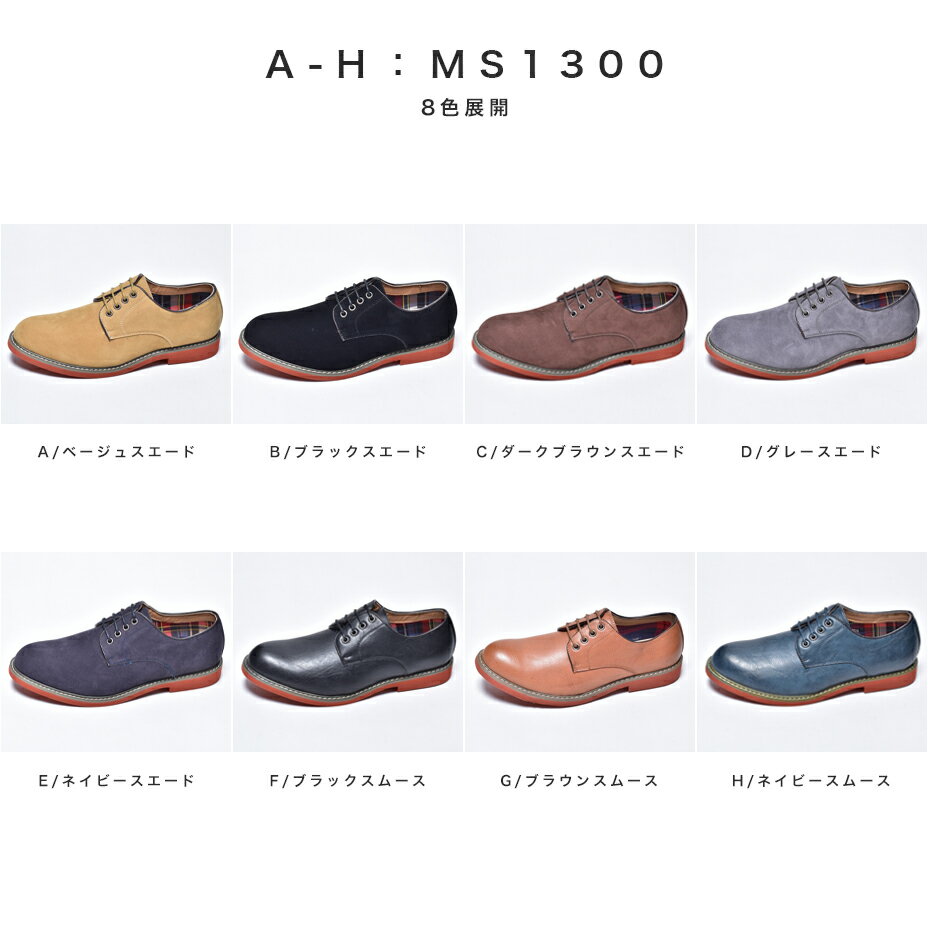 カラー展開 ベージュスエード / ブラックスエード / ダークブラウンスエード / グレースエード / ネイビースエード / ブラックスムース / ブラウンスムース / ネイビースムース サイズ展開 39(24.5cm) / 40(25.0cm) / 41(25.5cm) / 42(26.0cm) / 43(26.5cm) / 44(27.0cm) / 45(27.5cm) / 46(28.0cm) ヒール高 MS1300:約2.8cm SPT015-1:約2.3cm ワイズ 3E (EEE) 相当 素材 【アッパー】合成皮革(フェイクレザー) / 【ソール】合成素材 合成皮革の特徴 レザーより「雨に強く、カビがつきにくい性質」 また、お手入れも簡単で普段使いには最適な素材です。